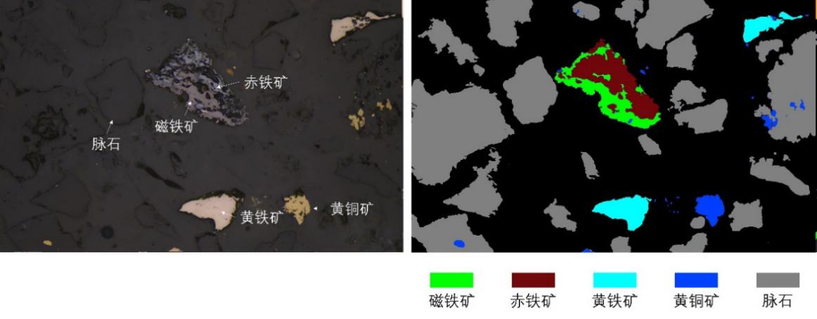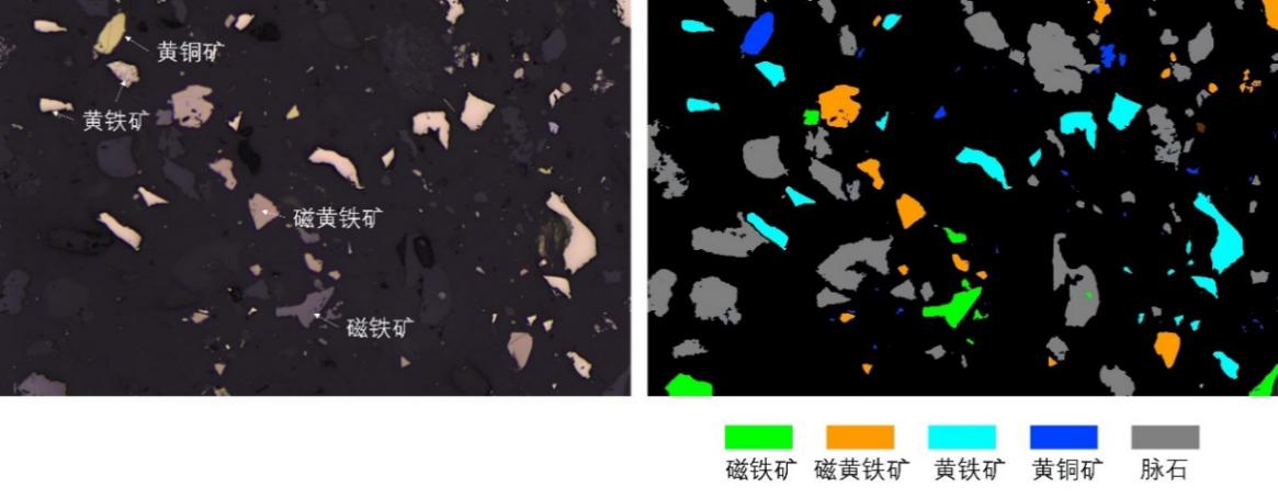 图2 矿物智能识别效果对比图(左:原始显微镜图像;右:MCPAS自动识别标注不同矿物的伪彩图)